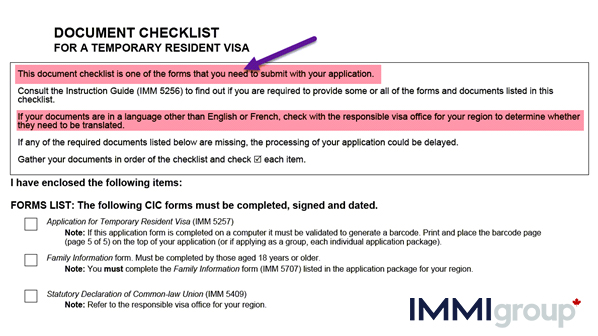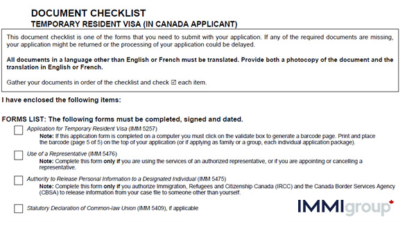 - IMM 5484 – Document Checklist – Temporary Resident Visa (Visitor Visa) outside of Canada
