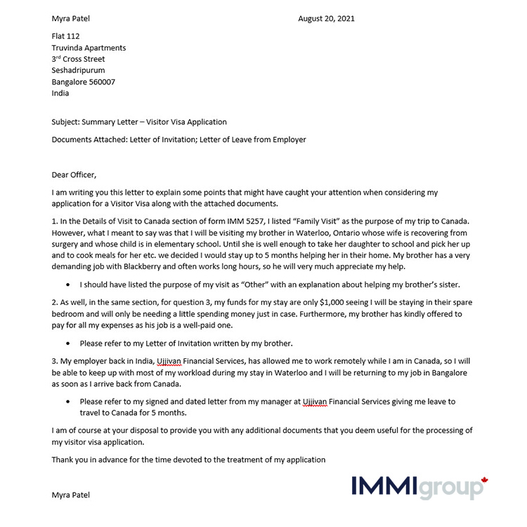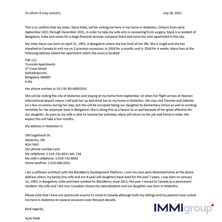 In addition, our applicant Myra Patel will also include a Letter of Invitation from her brother who lives in Canada and with whom she’ll be spending several months. Here’s the sample Invitation Letter: