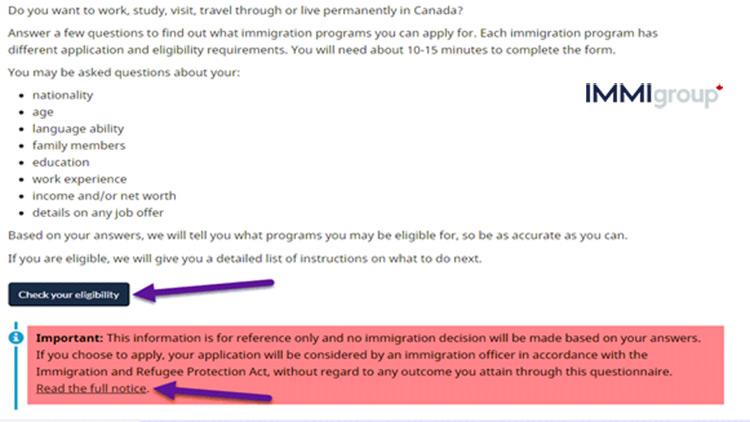 - This is a set of questions used to determine your eligibility. Go here to use the tool, but please remember that the final determination on your eligibility to come to Canada will be made by IRCC officials at your Port of Entry or before you enter. Here’s the Come to Canada tool’s webpage. Scroll down until you see the following: