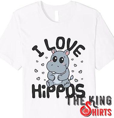 Against the crisp white background of the T-shirt, the words "I Love Hippos" are elegantly displayed in a simple black font. The choice of a simple font complements the cute cartoon hippo, allowing the focus to be on the endearing character and the expression of love for hippos. The combination of the "I Love Hippos" phrase with a heart-shaped design enhances the overall cuteness and appeals to those who appreciate adorable and charming elements.