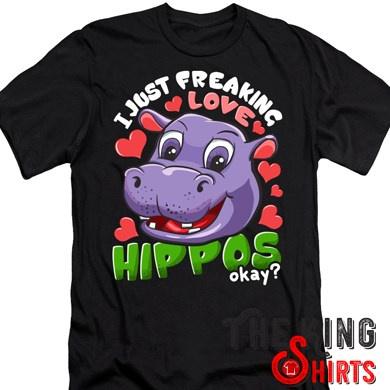 The remaining words, "I Just Freaking Love" and "Okay?" are written in white, complementing the other elements and standing out against the black backdrop. The use of the word "freaking" adds emphasis, indicating a high level of enthusiasm and passion for these animals. It suggests that the wearer's love for hippos is intense and unwavering. Adding the word "Okay?" implies that women will not feel the need to justify or explain their love for hippos. It conveys a feeling of confidence in their interests, regardless of the opinions or judgments of others.