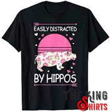 Beneath the hippo, a white arrow playfully pierces through the flowers, symbolizing the distractibility that hippos evoke. It adds a touch of whimsy to the design, highlighting the theme of being easily captivated by these fascinating animals. The words "Easily" and "Hippo" are prominently displayed in pink and curvy font, while the word "Distracted" is written in white and straight font, creating a visual contrast and ensuring legibility against the vibrant backdrop. The "Easily Distracted By Hippos" t-shirt conveys a sense of humor and a lighthearted appreciation for hippos. It allows the women to express their fascination with these animals in a playful and relatable way, creating a fun and engaging message for others to enjoy.