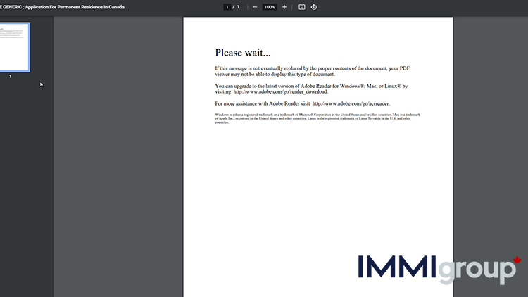 Having downloaded Adobe Acrobat Reader, your computer may still not be able to open the form on IRCC’s site. This means that your web browser uses other software, and in this case, you will need to download the file directly to your computer. There may be a download button (usually a down error) or a save button (a floppy disc icon). But if you cannot see either, you will have to click the back button on your browser and download the file without opening it in your browser.