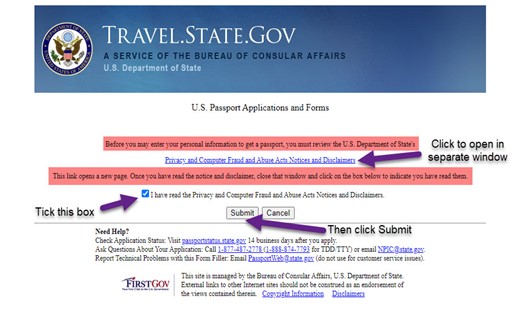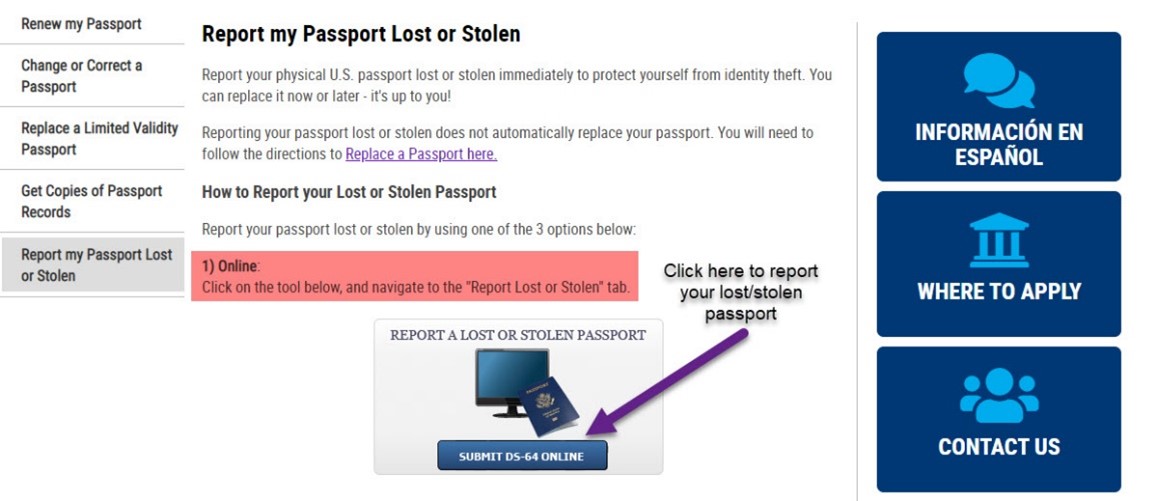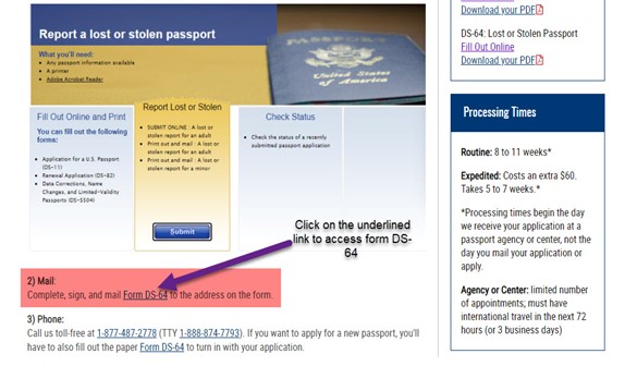 Tick the box and click Submit. You’ll then you’ll be taken here to begin the online process of reporting your lost or stolen passport by filling out form DS-64: