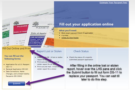 Once you’ve submitted your report, you can then (although this is optional, it is recommended) hover over the LHS pane to begin filling out form DS-11 online.