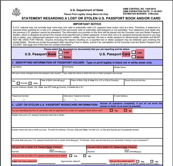 - Section 2 (LOST OR STOLEN U.S. PASSPORT BOOK/CARD INFORMATION